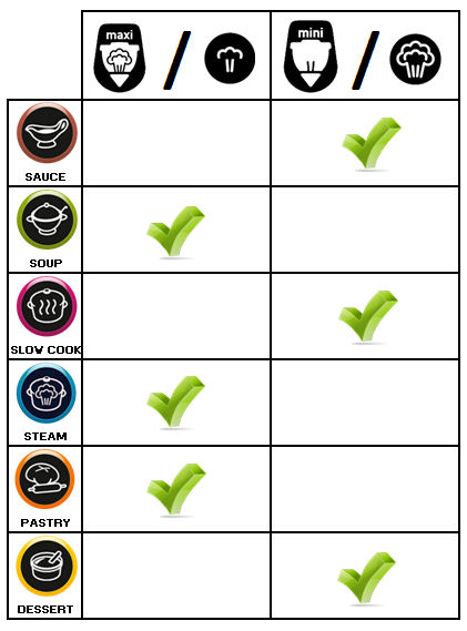 Speed, cooking temperature and duration are pre-programmed. There are 6 automatic programmes available: Sauces, Soups, Stews, Steam cooking, Pastry, Desserts.
